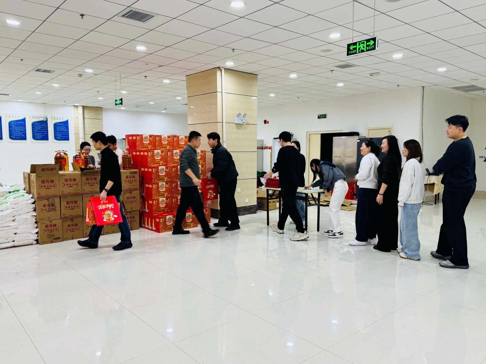 福利发放现场温馨祥和、秩序井然。一箱箱满载心意的福利物资整齐摆放,各部门员工有序排队、依次领取。工作人员热情周到、细致高效,在分发物资的同时,向每一位同事送上新春问候与美好祝福。